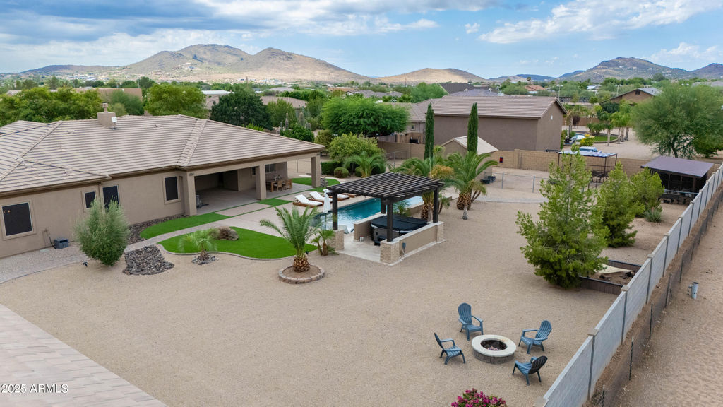 Luxury and freedom meet at this 2016 single-level estate on a full acre in Desert Hills.NO HOA,8-car parking,pool,RV access, and horse privileges. Set on a private paved road, this custom Ranch delivers serious space for toys with an attached 4-car garage plus a detrached 4-car shop. Double RV gates and long level drives make trailering effortless. A split guest wing offer (3) ensuite bedrooms: a flexible fifth bedroom/office adds options. The Primary suite flows to the patio and pebble-finish pool with covered BBQ bar. Corral, storage, workshop, endless potential. Minutes to I-17, TSMC corridor, and North Valley trails. NO HOA. Horses, RV's, and projects welcome.