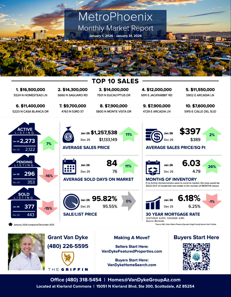 In the coming months, it’s important to watch whether Metro Phoenix inventory continues to build, as sustained supply above six months would keep negotiating leverage tilted toward buyers. It will also be critical to track whether pricing holds or softens as more mid-range homes close, since recent price gains were influenced by higher-end transactions rather than broad market acceleration. Finally, mortgage-rate movement near the low-6% range will matter most in how it affects buyer confidence, but inventory levels and pricing discipline will remain the primary drivers of market outcomes.